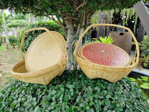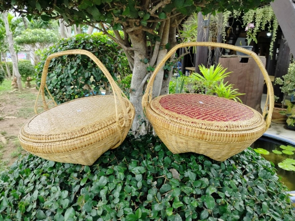 กระเช้าไม้ไผ่สาน มีฝาปิด สำหรับใส่ของได้หลากหลาย ไปงานบุญหรือมอบเป็นของขวัญของที่ระลึกได้ งานฝีมือภูมิปัญญาคุณลุงพาน ต.สระพัง อ.เขาย้อย จ.เพชรบุรี ราคาใบละ 1,200 บาท (จำหน่ายในศูนย์วัฒนธรรมไทยทรงดำเขาย้อย